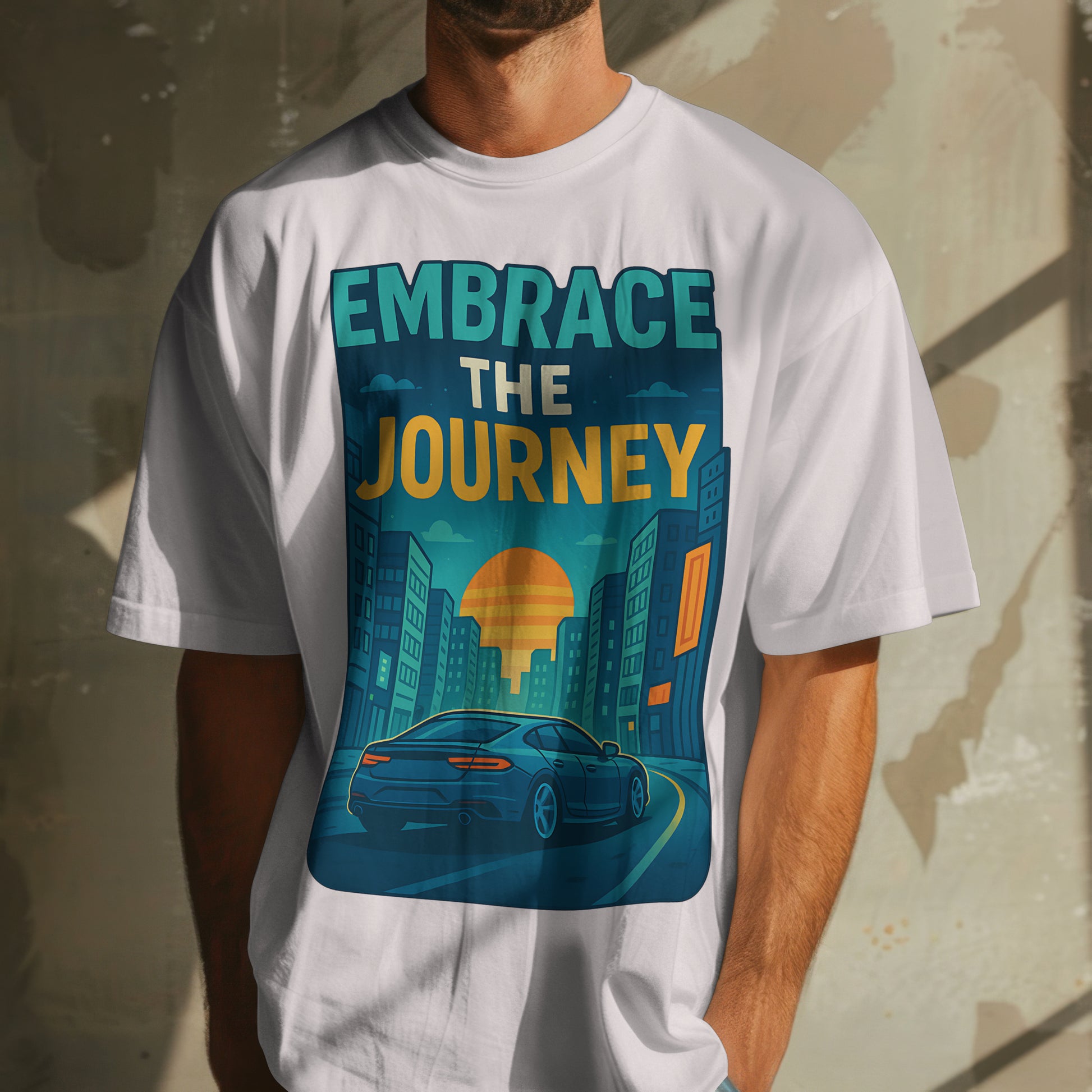 Hit the road in style with our "Embrace the Journey" graphic tee. This bold, retro-inspired design features a sleek blue sports car cruising through a vibrant cityscape, framed by modern skyscrapers and a warm sunset. With dynamic typography and a lively color palette, this shirt makes a statement wherever you go. Whether you're rocking it for a casual day out or adding a bit of flair to your evening look, this shirt captures the spirit of adventure and the thrill of the journey.