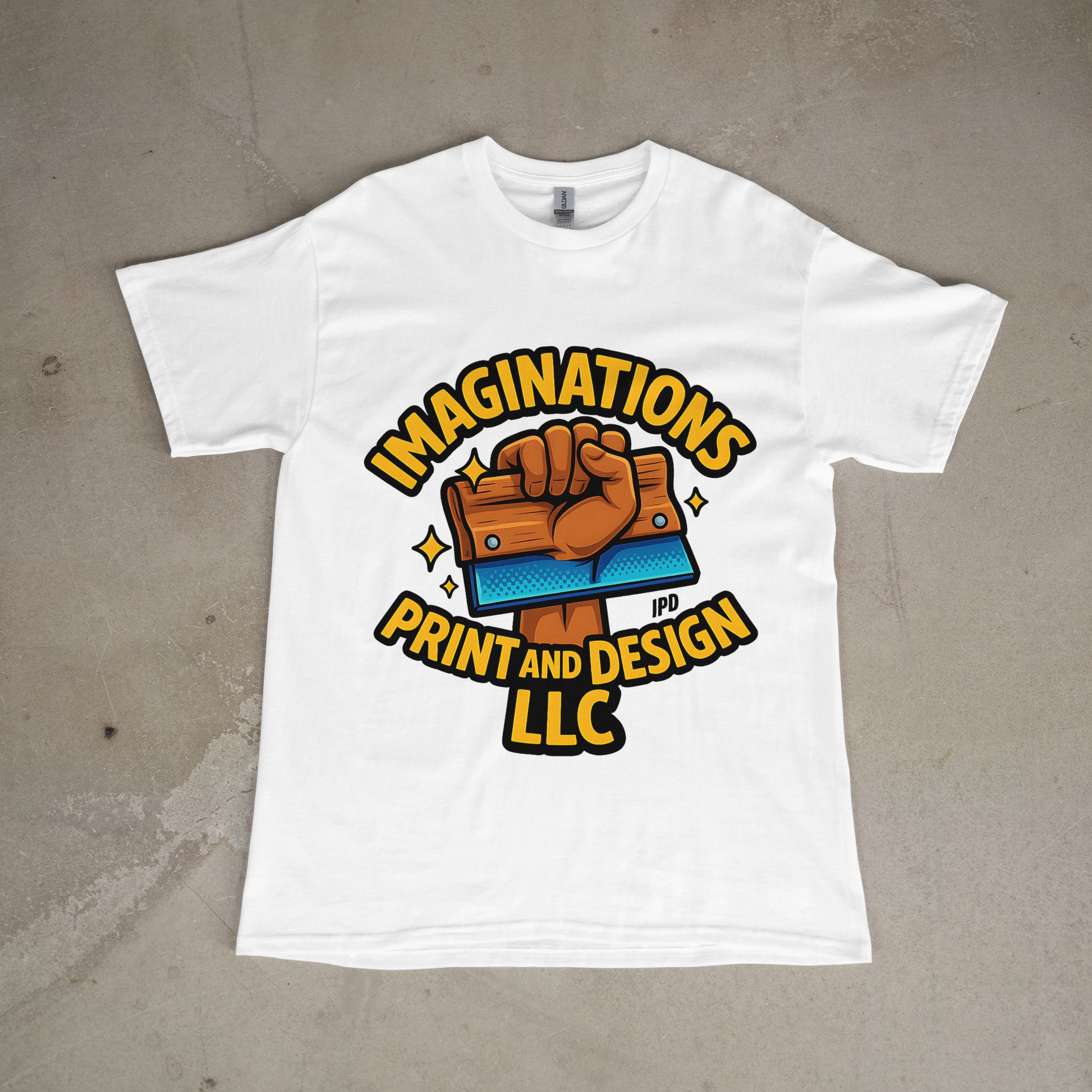 Level up your streetwear game with the Imaginations Print and Design LLC Logo Tee – where bold hustle meets creative drip. Featuring a striking raised fist clutching a squeegee, this urban graphic tee reps hard for creatives, printers, and go-getters. The custom “IPD” design brings authentic culture, while the premium cotton blend gives comfort that lasts from sun-up to hustle-down.